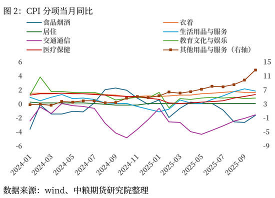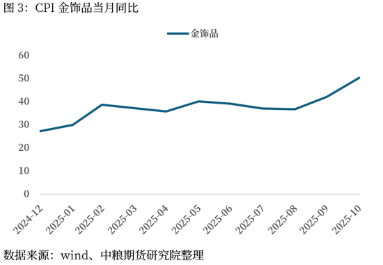 先以拆解CPI入手,如图所示,价格相对景气的分项为衣着、生活用品与服务、教育文化与娱乐、医疗保健、其他用品与服务,如果以2021年统计局披露的权重粗略计算,拉动CPI大约为0.1%(衣着)、0.1%(生活用品与服务)、0.1%(教育文化与娱乐)、0.2%(医疗保健)、0.4%(其他)。最为显著的变化,是其他项目,而其他项目中最为显著变量,是金银珠宝。统计局自2024年12月开始披露,今年金饰品价格增速持续走高,9月增速已超过50%。