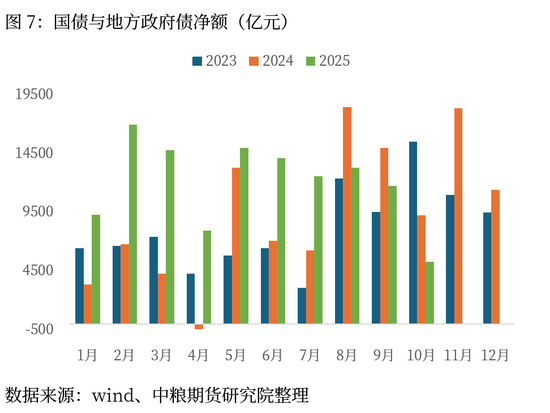 所以未来内需能否因科技革命的财富效应联动回暖,以及带动相关资产开始补涨,外因取决于财政能否继续进行足量的支持,内因取决于收入的上行。从边际预期的维度,十五五规划坚持挖掘新型需求的方向,可能决定了政策对传统需求始终以支撑为主,而非拉升。当前经济势头良好,风险偏好强劲,二季度政治局会议对于化债的定调显著强化。近期财政部发言,将不新增地方隐性债务视为铁的纪律。对应债务的发行,可以发现国债与地方政府债净发债强度,8月开始有了明显的减弱。那么有限的财政资源结合十五五规划,更可能是结构性的消费引导,而非全面刺激。