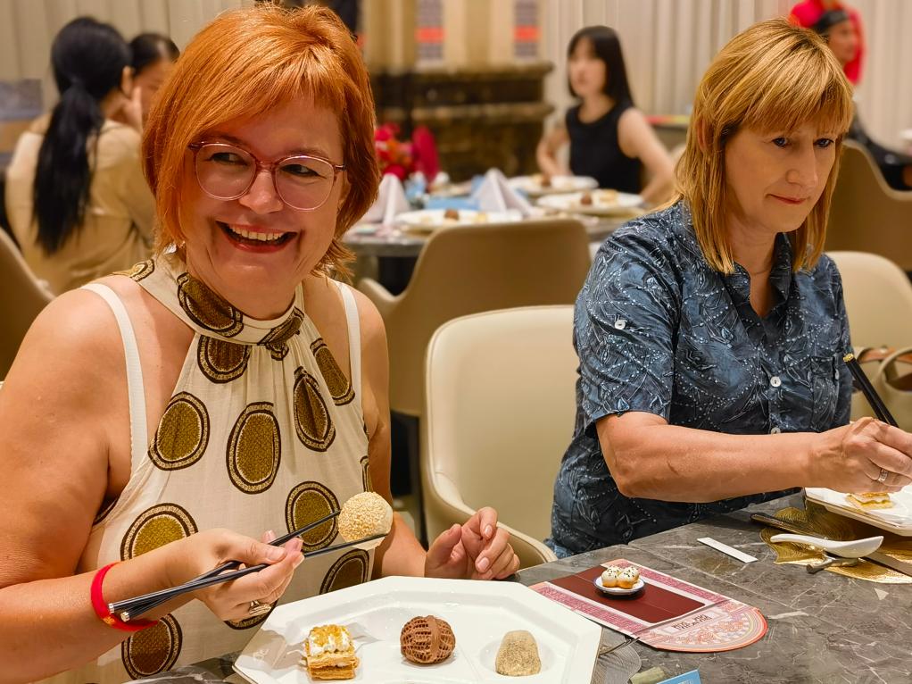 9月14日,入境游客品尝上海特色小吃。新华社记者 陈爱平 摄