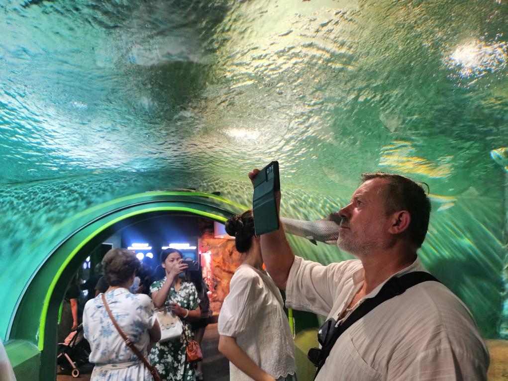 8月27日,一名入境游客参观上海海洋水族馆。新华社记者 陈爱平 摄
