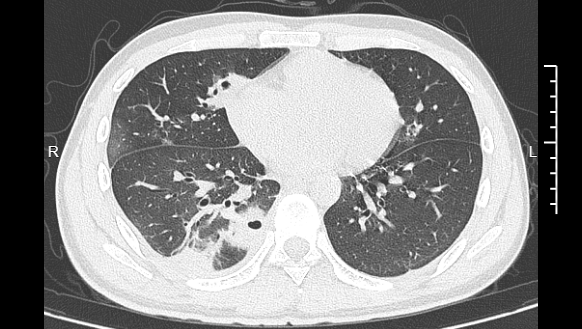 熬到第三天,小林已经烧到39℃,赶紧来到宁波大学附属第一医院就诊。接诊的丁群力主任医师一看他的症状,立刻安排了CT检查。结果显示:小林的肺里有十几个空洞,部分肺组织已经坏死,这是典型的血源性肺脓肿。